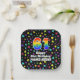 This cheerful and vibrant birthday-themed paper plate design features a large number “61” with a rainbow spectrum gradient inspired pattern, along with the message “Happy 61st Birthday,”, and an editable name. The background features a vibrant and colourful pattern featuring many star shapes with different colours and sizes. Paper plates like this might be used at a birthday party for somebody who is celebrating their sixty first birthday. [~Z0000582]