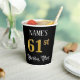 This elegant and luxurious birthday-themed paper cup design features a customisable name and the message “61st Birthday Party”. The large number “61st” has a faux/imitation gold-inspired colouring pattern, the words “Birthday Party” are in ornate script-style text, and the background is coloured black by default (although it can be customised). Fancy, opulent paper cups like this might be useful to have at a birthday party being held in celebration of somebody’s sixty first birthday. [~Z0000567]