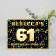 The front of this upbeat sixty-first birthday party/celebration foil invitation card design features a personalised name, a large number “61st”, the message “BIRTHDAY PARTY!”, and a border. The background of the front has a joyful, multicolored star shapes pattern. The back features personalised details about the event, such as the date, time, location/venue, and any other important information. Editable invitations like these might be a fun way to invite guests/attendees to a birthday gathering being held in celebration of somebody’s 61st birthday. [~Z0000600]