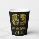 This 1920s/1930s style inspired and vintage appearance birthday-themed paper cup design features a large art deco inspired style number “63”, in addition to the birthday greeting message “Happy 63rd Birthday,” and an editable name. It also has a black-coloured background. 1920s/1930s style inspired paper cups like this might be used when hosting a party for somebody in celebration of their 63rd birthday. [~Z0000546]