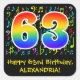 This fun, vibrant, and colourful birthday-themed sticker design features a large number "63" having a rainbow spectrum gradient inspired pattern. It also features the message "Happy 63rd Birthday,", and a personalised name. Part of the background has a colourful music notes and symbols pattern. Fun, customisable birthday stickers like this might be used as a birthday party decoration, or perhaps given as a birthday present, or perhaps be used when wrapping birthday gifts being given to celebrate a song composer’s, a singer’s, a musician’s, or somebody else’s sixty third birthday. [~Z0000423]