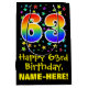 This vibrant, exciting, and colourful birthday themed gift bag design features a large number "63" with a rainbow spectrum gradient style pattern, along with the message "Happy 63rd Birthday,", and a personalised recipient name. It also has a colourful background pattern featuring star shapes of various sizes. A giftbag like this might be used when giving a gift or present in honour of somebody’s sixty third birthday. [~Z0000510]