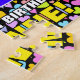 This colourful and exciting birthday jigsaw puzzle design features a large number “63” with a multicolored rainbow spectrum inspired gradient pattern, along with the message “HAPPY 63rd BIRTHDAY,”, and a customisable recipient name. The background has a joyful, colourful, hearts pattern. A vibrant, editable birthday puzzle like this might be used to celebrate somebody’s sixty-third birthday. [~Z0000611]
