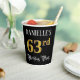 This luxurious and ornate birthday themed paper cup design features a custom name and the message “63rd Birthday Party”. The large number “63rd” has a faux/imitation gold-inspired colouring pattern, the words “Birthday Party” are in fancy script-style text, and the background is coloured black by default (although it can be customised). Elegant, fancy paper cups like this might be useful at a birthday celebration being held in celebration of somebody’s sixty third birthday. [~Z0000567]