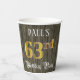 This fancy and luxurious birthday themed paper cup design features an editable name and the message “63rd Birthday Party”. The large number “63rd” has an imitation/faux gold-inspired colouring pattern, the words “Birthday Party” are in opulent script-style text, and the background has an imitation/faux woodgrain-inspired look. Elegant, ornate paper cups like this might be used at a birthday celebration being held to honour somebody’s sixty third birthday. [~Z0000568]