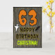 The front of this spooky and scary Hallowe'en birthday themed greeting card design features a large number "63". It also features the message "HAPPY BIRTHDAY,", plus a custom name. There are also depictions of a bat and a ghost on the front. The inside features an editable birthday greeting message, or could perhaps be cleared and left blank if a message is to be written by hand instead. A customizable birthday card like this might be a fun way to send a message in celebration of somebody’s sixty third birthday that also falls on Halloween (October 31st). [~Z0000410]