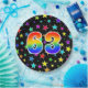 This colourful, cheerful, and fun paper plate design features a large number "63" containing a rainbow spectrum gradient inspired pattern. The background features a pattern of colourful star shapes. Fun paper plates like this might be used at a celebration being held to honour somebody’s sixty third birthday, or a couple’s sixty third anniversary, or some other 63rd event. [~Z0000493]