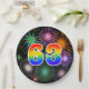 This cheerful, colourful, and fun paper plate design features a large number "63" containing a rainbow spectrum gradient inspired pattern. It also features a vibrant and exciting bursting celebratory fireworks inspired pattern. The background is coloured black. Paper plates like this might be fun to use at a party being held to celebrate somebody’s sixty third birthday, a 63rd anniversary, or some other 63rd event. [~Z0000490]