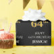 This elegant and luxurious birthday themed wrapping paper design features the message "HAPPY 64th BIRTHDAY,", a personalised name, and the birthday number "64th" having a faux/imitation gold inspired appearance pattern. The background is coloured black. Wrapping paper like this might be used when preparing presents to be given in celebration of somebody’s 64th birthday. [~Z0000454]