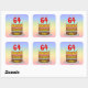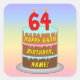This upbeat and colourful birthday square sticker design features a cartoon-style depiction of a three-tier birthday cake having numeral-shaped candles on top showing the number “64“, along with the message “HAPPY 64TH BIRTHDAY,”, and an editable recipient name. The background has a multi-colour pastel rainbow spectrum inspired gradient pattern. Joyful birthday themed stickers like these might be given out or used at a party celebrating somebody’s 64th birthday, or perhaps used when preparing gifts/presents or invitations for such an event. [~Z0000624]