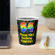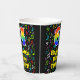This fun and joyful music themed birthday paper cup design features a large number “64” having a rainbow spectrum gradient inspired pattern. It also features the message “Happy 64th Birthday,”, and a customisable name. The background features an exciting and colourful pattern of various music notes and symbols having a variety of sizes and colours. Vibrant, colourful paper cups like this might be fun to have at a birthday party being held to honour somebody’s 64th birthday. [~Z0000541]