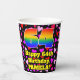 This colourful and fun birthday paper cup design features a large number “64” with a rainbow spectrum gradient inspired pattern, along with the message “Happy 64th Birthday,”, and a customisable name. The background features a pattern of heart shapes with colours like purple, red, and pink. Cheerful, fun paper cups like this might be fun to have at a birthday celebration being held in celebration of somebody’s sixty fourth birthday. [~Z0000548]