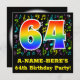 The front of this fun, exciting, and colourful birthday party invitation design features a large number "64" having a rainbow spectrum gradient inspired pattern. It also features a customisable name and the message "64th Birthday Party!". Part of the background has a fun and colourful music notes and symbols pattern. The back features customisable information/details regarding the event that the potential guests are being invited to. Fun, customisable birthday celebration invitation cards like this might be sent to potential guests of a gathering being held to honour a musician’s, a singer’s, a song composer’s, or somebody else’s sixty fourth birthday. [~Z0000427]