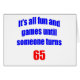 It's all fun and games until someone turns 65. Humourous 65th birthday design for the 65 year old who has a sense of humour about their age. Makes a great 65th birthday gift.