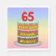 This fun and colourful birthday themed paper napkin design features a cartoon-style depiction of a three-tier birthday cake having number-shaped candles on top showing the age “65“, along with the message “HAPPY 65TH BIRTHDAY,”, and a customisable recipient name. The background has a multi-colour pastel rainbow spectrum inspired gradient pattern. Paper napkins like these might be used at a party for somebody who is celebrating their 65th birthday. [~Z0000623]
