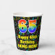 This cheerful and exciting music-themed birthday paper cup design features a large number “65” with a rainbow spectrum gradient inspired pattern, along with the message “Happy 65th Birthday,”, and an editable name. The background features a multicolored pattern having music notes and symbols of various sizes and colours. Colourful, vibrant paper cups like this might be fun to use at a birthday celebration being held to celebrate somebody’s 65th birthday. [~Z0000541]
