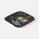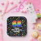 This vibrant and colourful birthday-themed paper plate design features a large number “65” with a rainbow spectrum gradient inspired pattern, along with the message “Happy 65th Birthday,”, and a personalised name. The background features an exciting and colourful pattern featuring many star shapes with different colours and sizes. Exciting paper plates like this might be fun to use at a party being held for somebody who is celebrating their 65th birthday. [~Z0000582]