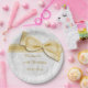 Elegant Birthday Party Paper Plates for women. 65th birthday party plates for birthdays. Beautiful white damask pattern background with a pretty, stylish romantic gold bow and ribbon image. These glamourous, chic, classy custom party paper plates are beautifully sophisticated and is are perfect for all ages. All text is fully customisable to meet your requirements. PLEASE NOTE: All cake picks on Zazzle have flat printed images. Bow and ribbon images purchased from digital-designs-by-elena. If you need any assistance customising your product please contact me through my store and I will be happy to help.