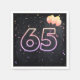 Glowing neon sign on black background with party balloons and confetti for 65th birthday party.