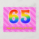 The front of this cheerful, loving, and fun birthday postcard design features a large number "65" with a rainbow spectrum gradient inspired pattern, along with the message "Happy 65th Birthday,", and a custom recipient name. The front additionally has a joyful dark pink and light pink heart shapes and stripes pattern. The back features a customisable birthday greeting message, or could perhaps be cleared and left blank if a message is to be written by hand instead. A customisable birthday postcard like this might be a fun way to send a message in celebration of somebody’s sixty fifth birthday. Postcards like this might also be used to invite guests to a birthday party being held for somebody who is turning 65 years old. [~Z0000449]