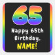 This joyful and cheerful birthday-themed square sticker design features a big number “65“ with a colourful rainbow spectrum inspired gradient pattern, along with the message “Happy 65th Birthday,”, and an editable recipient name. Vibrant birthday themed stickers like these might be given out or used at a party for somebody who is celebrating their 65th birthday, or perhaps used when preparing invitations or wrapping presents for such an event. [~Z0000630]