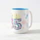 Funky, vintage-modern, carnival, coloured happy birthday mug with hand drawn numeric candles celebrating 65 something years.