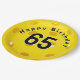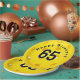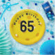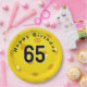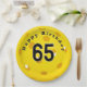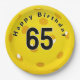 Close-up of a neon yellow pickleball for a 65th birthday.
