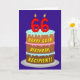 The front of this joyful and cheerful birthday-themed greeting card design features a depiction of a three-tier birthday cake having number-shaped candles on top showing the age “66“, along with the message “HAPPY 66TH BIRTHDAY,”, and a custom recipient name. The inside has a custom birthday greeting message, or could perhaps be cleared and left blank if a message is to be written by hand instead. An upbeat, editable birthday greeting card like this might be used to celebrate somebody’s sixty-sixth birthday. [~Z0000620]