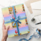 This cheerful and colourful birthday themed wrapping paper design features a cartoon-style depiction of a three-tier birthday cake having number-shaped candles on top showing the age “66“, along with the message “HAPPY 66TH BIRTHDAY,”, and a custom recipient name. The background features a multi-colour pastel rainbow spectrum inspired gradient pattern. Wrapping paper like this might be used when giving a gift or present in honour of somebody’s 66th birthday. [~Z0000622]
