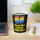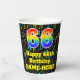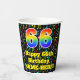 This colourful and cheerful music-themed birthday paper cup design features a large number “66” with a rainbow spectrum gradient inspired pattern, along with the message “Happy 66th Birthday,”, and a customisable name. The background features a multicolored pattern of various music notes and symbols having a variety of sizes and colours. Vibrant, colourful paper cups like this might be fun to have at a birthday party/celebration being held to honour somebody’s 66th birthday. [~Z0000541]