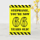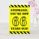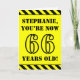 The front of this bold and fun birthday-themed greeting card design features a personalized name and the message "YOU’RE NOW 66 YEARS OLD!" in black stencil inspired text on a yellow colored background. The front also features an eye-catching yellow and black stripes pattern at the top and bottom edges. The inside features a custom birthday greeting message, or could perhaps be cleared and left blank if a message is to be written by hand instead. A customizable birthday card like this might be a fun way to acknowledge somebody’s sixty sixth birthday. [~Z0000413]