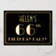 The front of this 1920s-1930s style inspired sixty-sixth birthday celebration/party foil invitation features a personalised name, a large art deco style inspired number “66th”, the message “BIRTHDAY PARTY”, and a border pattern consisting of lines. The front also has a black-coloured background by default, but it can be customised to a different colour if desired. The back features personalised details about the event, such as the date, time, venue, and any other important information. Luxurious, elegant, personalised invitations like these might be used to invite guests to a birthday gathering being held to celebrate somebody’s 66th birthday. [~Z0000591]