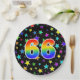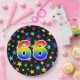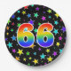 This colourful, cheerful, and fun paper plate design features a large number "66" coloured with a rainbow spectrum gradient inspired pattern. The background features a colourful star shapes pattern. Paper plates like this might be used when celebrating somebody’s sixty sixth birthday, or a couple’s sixty sixth anniversary, or some other 66th event. [~Z0000493]