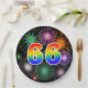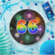 This fun, cheerful, and colourful paper plate design features a large number "66" containing a rainbow spectrum gradient inspired pattern colouring. It also features a exciting and vibrant bursting celebratory fireworks inspired pattern. It has a black coloured background. Paper plates like this might be used when celebrating somebody’s sixty sixth birthday, a 66th anniversary, or some other 66th event. [~Z0000490]