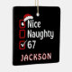 Bring a bit of social media-inspired humor to your holiday décor with this double-sided “Nice, Naughty, 67” ornament. Featuring the same cheeky design on both sides — bold red checkboxes, a Santa hat, and that mysteriously funny “67” — it’s a conversation starter for any tree. The crisp white lettering pops against the classic black background for a sleek, modern look that fits both minimalist and playful Christmas styles. Makes a hilarious stocking stuffer or small gift for friends, coworkers, or anyone who loves random internet jokes. Personalize with any name for an extra touch of fun.