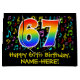 This fun, vibrant, and colourful birthday giftbag design features a large number "67" having a rainbow spectrum gradient inspired pattern. It also features the message "Happy 67th Birthday,", and a customisable name. Part of the background has a pattern of various music notes and symbols having a variety of colours and sizes. A birthday themed giftbag like this might be a fun way to wrap a gift or present being given to celebrate somebody’s sixty seventh birthday. [~Z0000425]