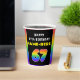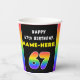 This upbeat and joyful birthday themed paper cup design features a big number “67“ having a colourful rainbow spectrum inspired gradient pattern, along with the message “HAPPY 67th BIRTHDAY,”, and a custom recipient name. Bold birthday themed paper cups like this might be used at a birthday party celebrating somebody’s sixty seventh birthday. [~Z0000639]