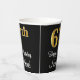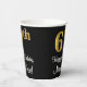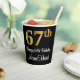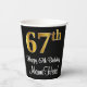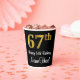 This elegant, luxurious, and sophisticated birthday-themed paper cup design features a large ordinal number “67th” having a faux/imitation gold-inspired look, along with the birthday greeting message “Happy 67th Birthday,” and a customisable name in a script-style font. The background is coloured black. Elegant birthday themed paper cups like this might be used at a party for somebody who is celebrating their 67th birthday. [~Z0000538]