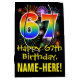 This fun, exciting, and colourful birthday-themed gift bag design features a large number "67" with a rainbow spectrum gradient style pattern, along with the message "Happy 67th Birthday,", and a custom recipient name. It also has a colourful background pattern inspired by the look of bursting celebratory fireworks. A fun gift bag like this might be used when wrapping presents being given to somebody in celebration of their 67th birthday. [~Z0000509]