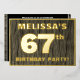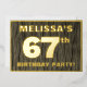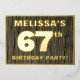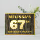 The front of this bold sixty-seventh birthday celebration foil invitation card features a customisable name, a large number “67th”, the message “BIRTHDAY PARTY!”, and a border, all in foil. The background of the front features a rustic, yet sophisticated, faux wood grain look inspired pattern. The back features personalised details about the event, such as the date, time, venue/location, and any other useful information. Editable invitations like these might be used to invite guests to a birthday party being held to celebrate somebody’s 67th birthday. [~Z0000598]