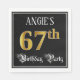 This elegant and luxurious birthday paper napkin design features a customisable name and the message “67th Birthday Party”. The large number “67th” has a faux/imitation gold-inspired colouring pattern, and the words “Birthday Party” are in fancy script-style text. The background is coloured black by default (although it can be customised). Ornate, fancy paper napkins like this might be useful to have at a birthday celebration being held to honour somebody’s sixty seventh birthday. [~Z0000565]