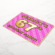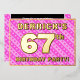 The front of this joyful and fun sixty-seventh birthday party/celebration foil invitation card design features a personalised name, a large number “67th”, the message “BIRTHDAY PARTY!”, and a border. The background of the front features a loving dark pink and light pink stripes pattern, with heart shapes. The back features personalised details about the event, such as the date, time, venue/location, and any other information that may be relevant. Customisable invitations like these might be a fun way to invite attendees/guests to a birthday gathering being held to celebrate somebody’s 67th birthday. [~Z0000603]