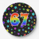 This fun, colourful, and cheerful paper plate design features a large number "67" containing a rainbow spectrum gradient inspired pattern colouring. The background features a colourful pattern of star shapes. Fun paper plates like this might be used at somebody’s 67th birthday celebration, or a couple’s 67th wedding anniversary party, or some other sixty seventh event. [~Z0000493]
