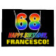 This colourful, fun, and cheerful birthday gift bag design features a large number "68" and the message "HAPPY BIRTHDAY,", both coloured with a rainbow spectrum gradient inspired pattern, along with a bold yellow editable recipient name. The background is coloured black. A fun gift bag like this might be used when wrapping presents being given to somebody in celebration of their 68th birthday. [~Z0000477]