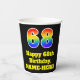 This colourful and exciting birthday paper cup design features a large number “68” with a rainbow spectrum gradient inspired pattern, along with the message “Happy 68th Birthday,”, and a personalised name. The background is coloured black. Colourful, vibrant paper cups like this might be fun to use at a birthday celebration being held in celebration of somebody’s sixty eighth birthday. [~Z0000537]