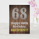 This country look and American Wild West inspired birthday greeting card design features a large rustic look number "68", the message "Happy 68th Birthday,", a personalised name, and a faux/imitation wood grain inspired look pattern background. The inside has a customised birthday greeting message, or could perhaps be cleared and left blank if a message is to be written by hand instead. An editable birthday greeting card like this might be used to acknowledge somebody’s sixty-eighth birthday. [~Z0000469]
