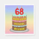 This joyful and colourful birthday paper napkin design features a cartoon-style depiction of a three-tier birthday cake having numeral-shaped candles on top showing the number “68“, along with the message “HAPPY 68TH BIRTHDAY,”, and a personalised recipient name. The background features a multi-colour pastel rainbow spectrum inspired gradient pattern. Upbeat birthday themed paper napkins like these might be used at a birthday party for somebody who is celebrating their sixty eighth birthday. [~Z0000623]