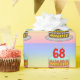 This joyful and colourful birthday wrapping paper design features a cartoon-style depiction of a three-tier birthday cake having number-shaped candles on top showing the age “68“, along with the message “HAPPY 68TH BIRTHDAY,”, and a customisable recipient name. The background has a multicolored pastel rainbow spectrum inspired gradient pattern. Fun wrapping paper like this might be used when wrapping presents being given to somebody in celebration of their 68th birthday. [~Z0000622]