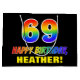 This cheerful, colourful, and fun birthday gift bag design features a large number "69" and the message "HAPPY BIRTHDAY,", both coloured with a rainbow spectrum gradient inspired pattern, along with a bold yellow customisable recipient name. The background is coloured black. A fun birthday themed gift bag like this could be used to wrap a gift or present being given to celebrate somebody’s 69th birthday. [~Z0000477]