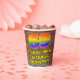 This fun and vibrant urban street art and graffiti themed birthday paper cup design features a large number “69” having a colourful rainbow spectrum gradient inspired pattern. It also features the message “Happy 69th Birthday,”, and an editable name. The background has a brick wall pattern. Vibrant, colourful paper cups like this might be fun to use at a birthday party being held to honour somebody’s 69th birthday. [~Z0000543]